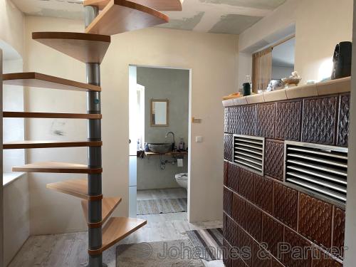 Das Haus wird momentan über den im Erdgeschoss befindlichen Kachelofen und einen neu aus 2023 installierten Ofen im Obergeschoss beheizt.
